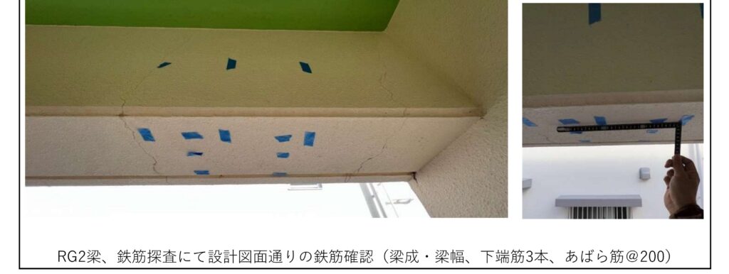 既存の図面があると、図面通りの鉄筋が施工されてるか確認できますが、図面がない場合は等間隔(@150,@200.@300)での確認をしたという内容で調査報告をします。